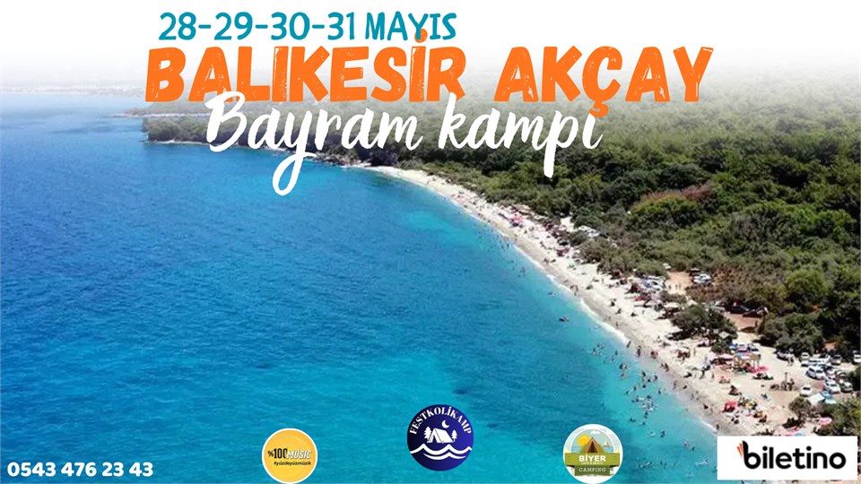 Kamp festivali / kamp partisi 28 May Perşembe Bi yer camping (Akçay) · Edremit · Balıkesir Balıkesir Akçay Bayram Kampı Festkolikamp · 28–31 Mayıs 2026, Edremit Akçay Bi yer camping. Denize sıfır kamp; müzik, yemek ve aktiviteler. Bilet: Biletino. 28 Mayıs 2026 500 ₺ — Biletino’da gösterilen k... İncele