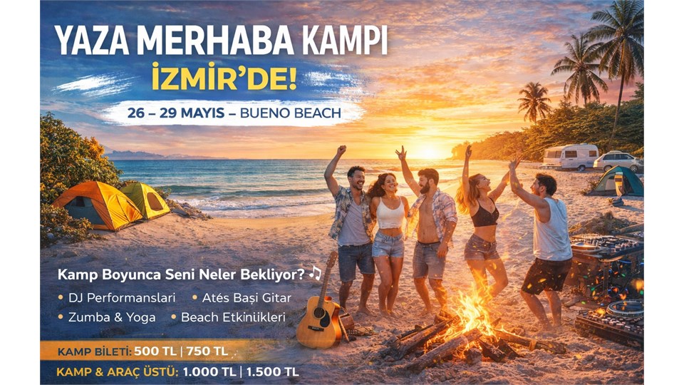 Kamp festivali / kamp partisi 29 May Cuma Bueno Beach · Konak · İzmir İzmir Yaza Giriş Kampı Gezginfest | 29–31 Mayıs 2026, İzmir Konak Bueno Beach. DJ, ateş başı gitar, zumba, yoga ve beach etkinlikleri. Bilet: Biletino. 29 Mayıs 2026 500 ₺ — Kamp girişi erken dönem... İncele